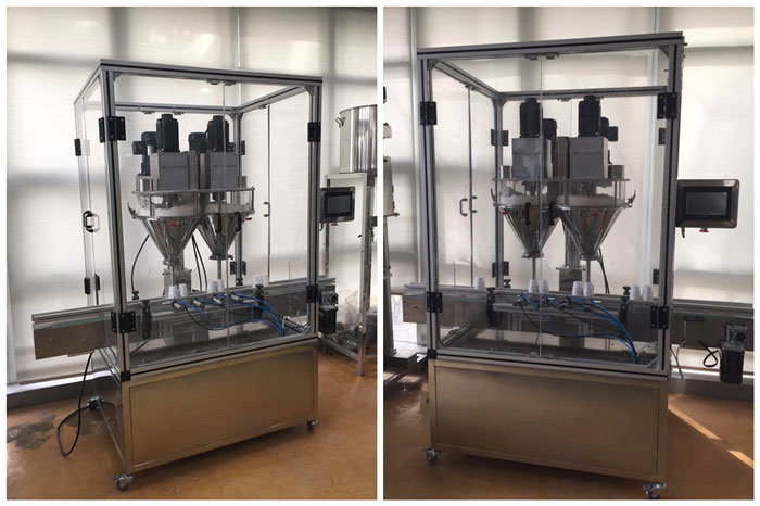 星火雙頭自動(dòng)粉劑灌裝機(jī)外觀以及灌裝展示: