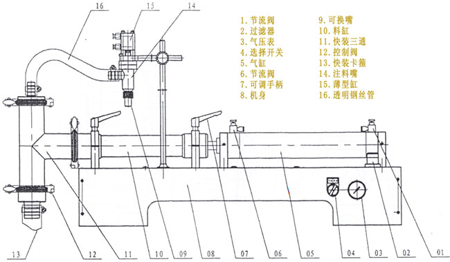 灌裝機(jī)為半自動(dòng)活塞式灌裝機(jī)。通過氣缸帶動(dòng)一個(gè)活塞來抽取和打出物料用單向閥控制物料流向,用磁簧開關(guān)控制氣缸的行程,即可調(diào)節(jié)灌裝量。