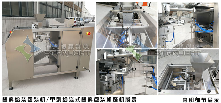 醬料給袋包裝機/單列給袋式醬料包裝機是星火公司專門針對自立袋醬料包裝所設(shè)計的一款新型給袋包裝機,采用全不銹鋼材質(zhì)制作,干凈衛(wèi)生,清潔方便,與物料接觸部件采用優(yōu)質(zhì)316L不銹鋼制作,符合食品加工機械的衛(wèi)生標(biāo)準(zhǔn),保證食品的衛(wèi)生和安全,PLC控制器,大屏顯示,操作簡單易學(xué),通過不同的計量器,可以適用于液體、醬體、顆粒、粉末、不規(guī)則塊狀物等物料的包裝,于多層復(fù)合膜、單層PE、PP等材料制成的預(yù)制袋、紙袋均可應(yīng)用。