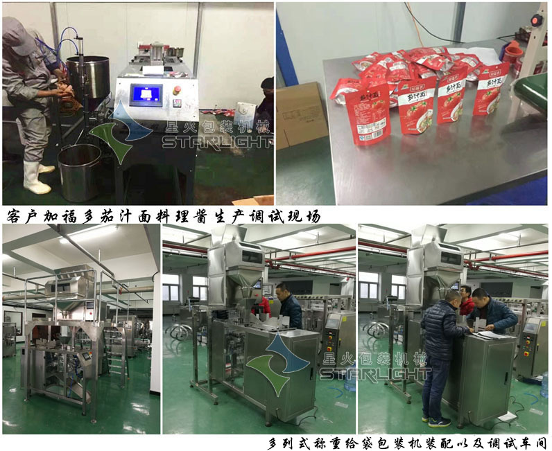 該機適用范圍廣泛,可采用多種計量方式,上圖中分別采用了顆粒醬料灌裝機、和多列組合稱等搭配試用,效率高,大大的節(jié)省企業(yè)的生產(chǎn)成本,提高企業(yè)效益。