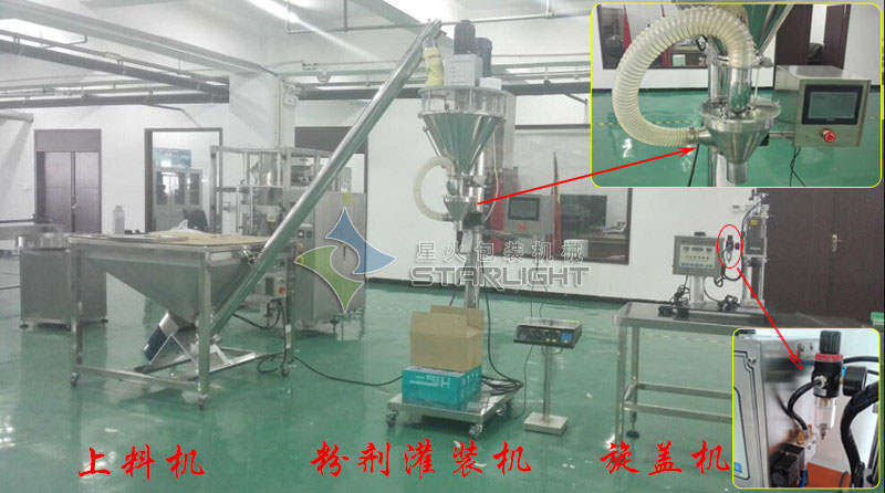 消防粉灌裝生產(chǎn)線/全自動(dòng)粉末灌裝生產(chǎn)線前部分工序設(shè)備:上料-粉劑灌裝-旋蓋